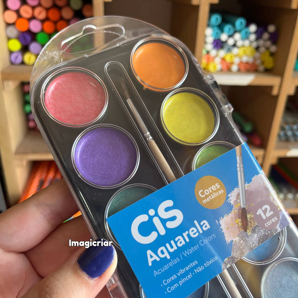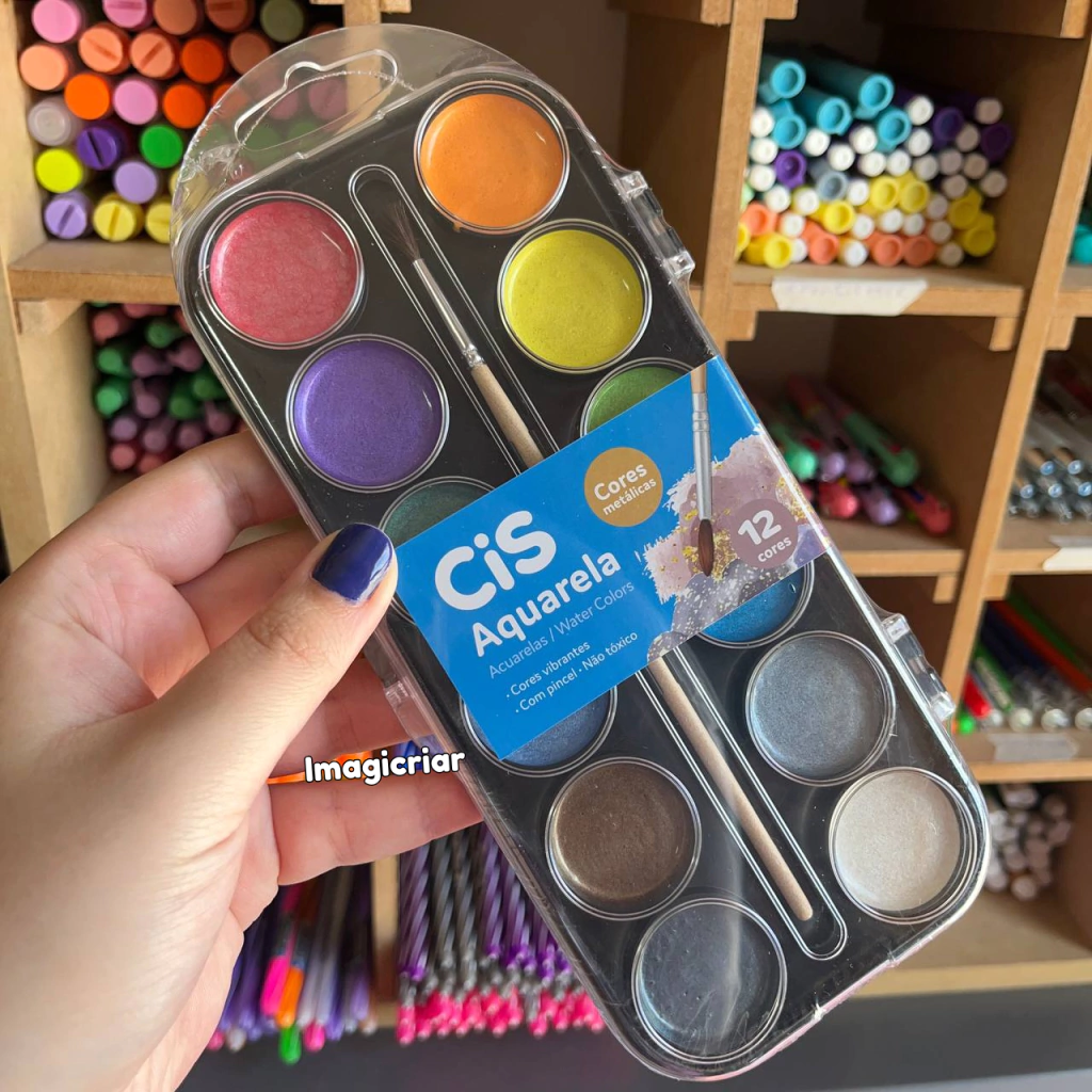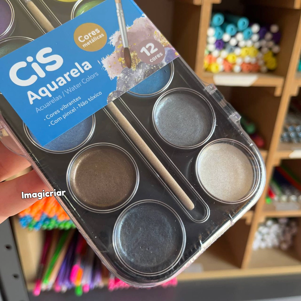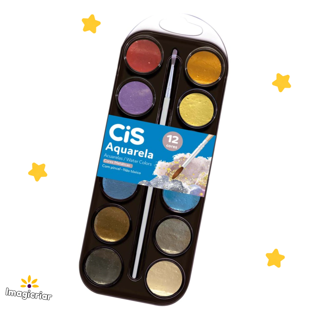 A Aquarela Metálica CiS é um estojo de aquarela com 12 pastilhas solúveis em água em lindas cores metálicas, com brilho.