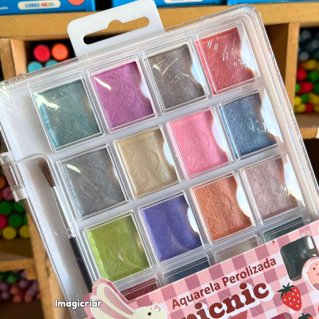 A Aquarela Perolizada Picnic é um estojo de aquarela com 12 pastilhas solúveis em água em lindas cores peroladas, com brilho!