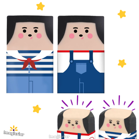 É uma borracha macia e que possui capa protetora de papel na estampa da roupinha do bonequinho.