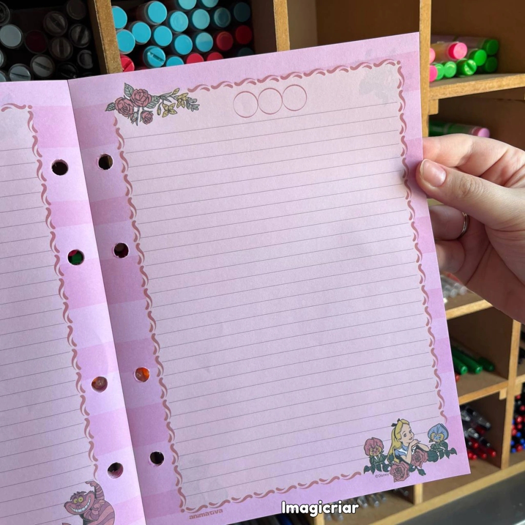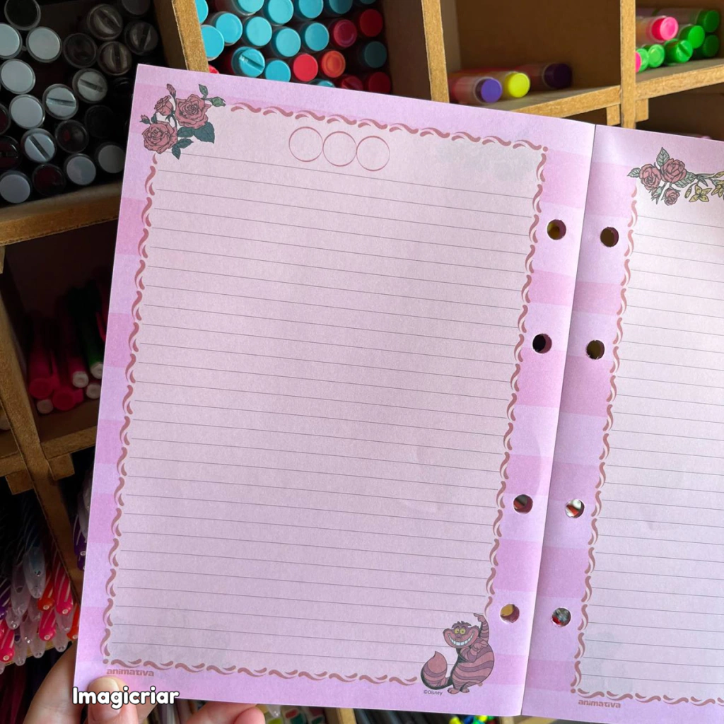 - Acompanha 160 folhas rosas pautadas (com linhas) decoradas de gramatura 63g/m² (com refil também podendo ser adquirido a parte);