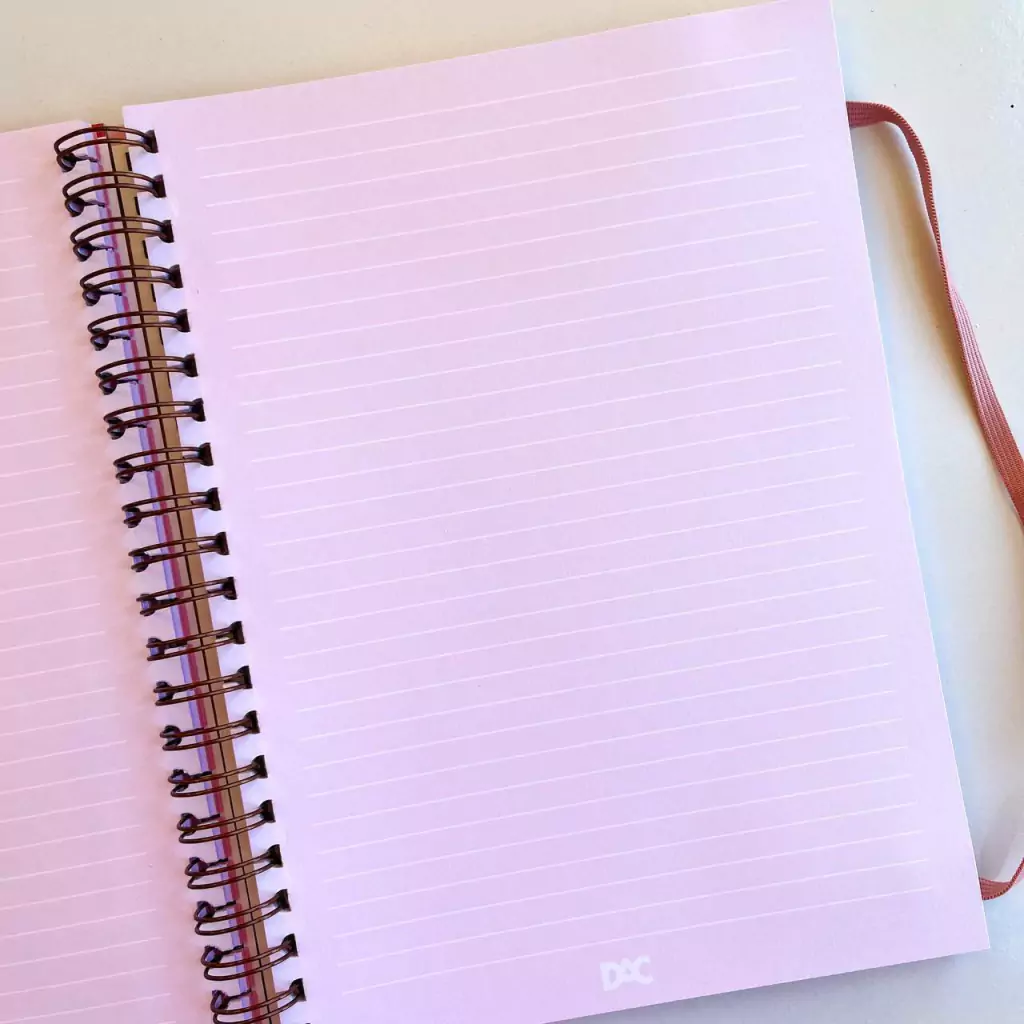 Possui espiral em Wire-o bronze, capa dura com hot stamping rosê, fechamento em elástico, 10 divisórias decoradas em papel e 80 folhas reposicionáveis pautadas rosas com linhas brancas e gramatura 90g/m².
