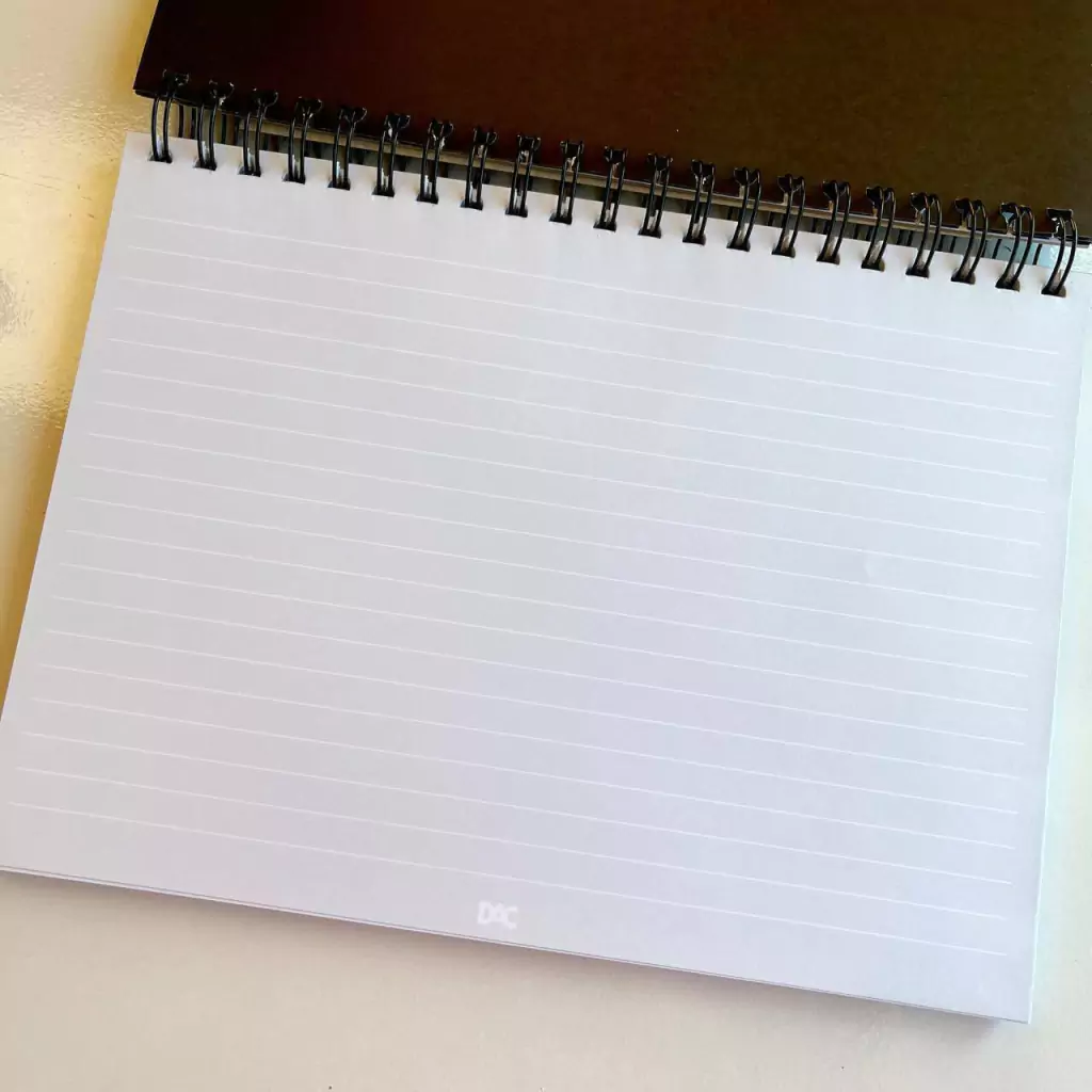 Possui espiral em Wire-o em metal, capa dura, 10 divisórias decoradas em papel e 80 folhas reposicionáveis azuis com linhas brancas (40 pautadas e 40 pontilhadas) e gramatura 90g/m².