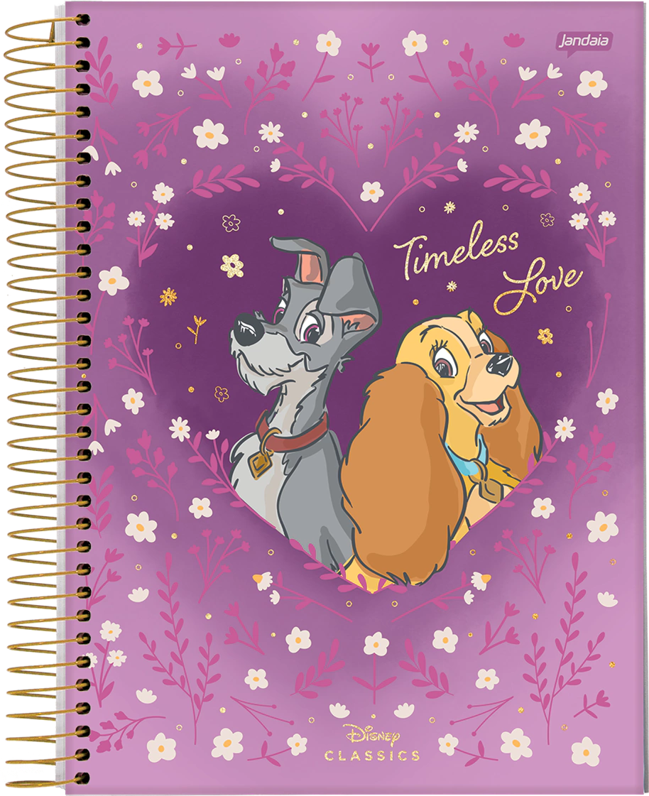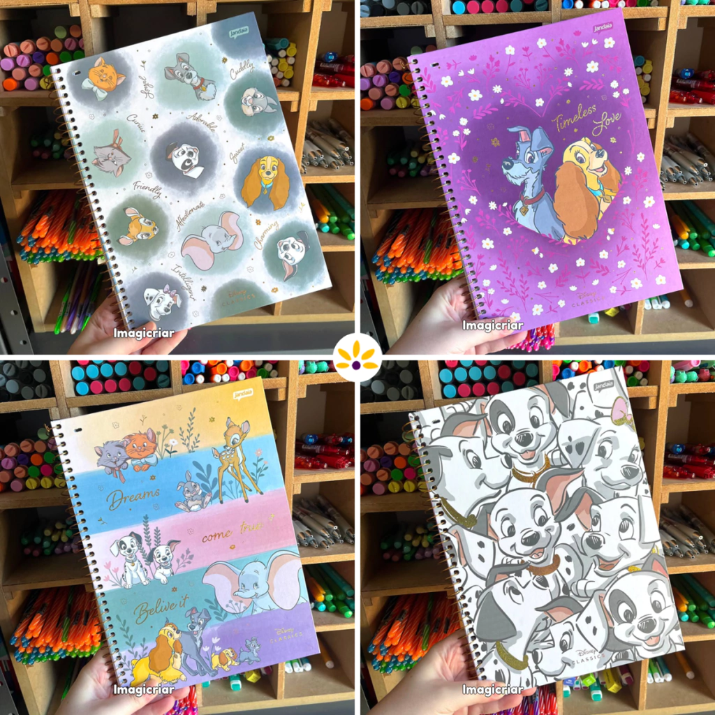 O caderno perfeito para quem ama os personagens Disney, como os dos filmes 101 Dálmatas, A Dama e o Vagabundo, Dumbo, Bambi e Aristogatas.