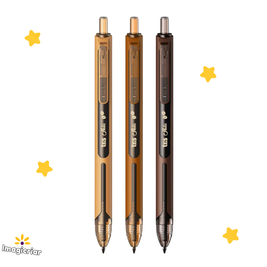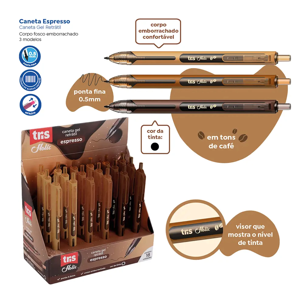 A caneta gel Espresso Tris são retráteis, possuem pontinha fina 0.5mm, tinta em gel na cor preta em todos os modelos, corpinho emborrachado fosco em 3 opções inspiradas em tons de café, proporcionando maior conforto ao escrever! Também conta com visor transparente para visualização do nível de tinta.