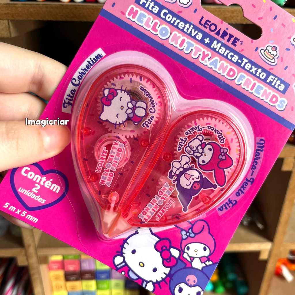 Fita Corretiva + Marca Texto em Fita perfeitos para quem ama a Hello Kitty e suas amigas My Melody e Kuromi! Super práticas para se usar e lindas, são incríveis para ter sempre por perto no estojo ou na mesa.