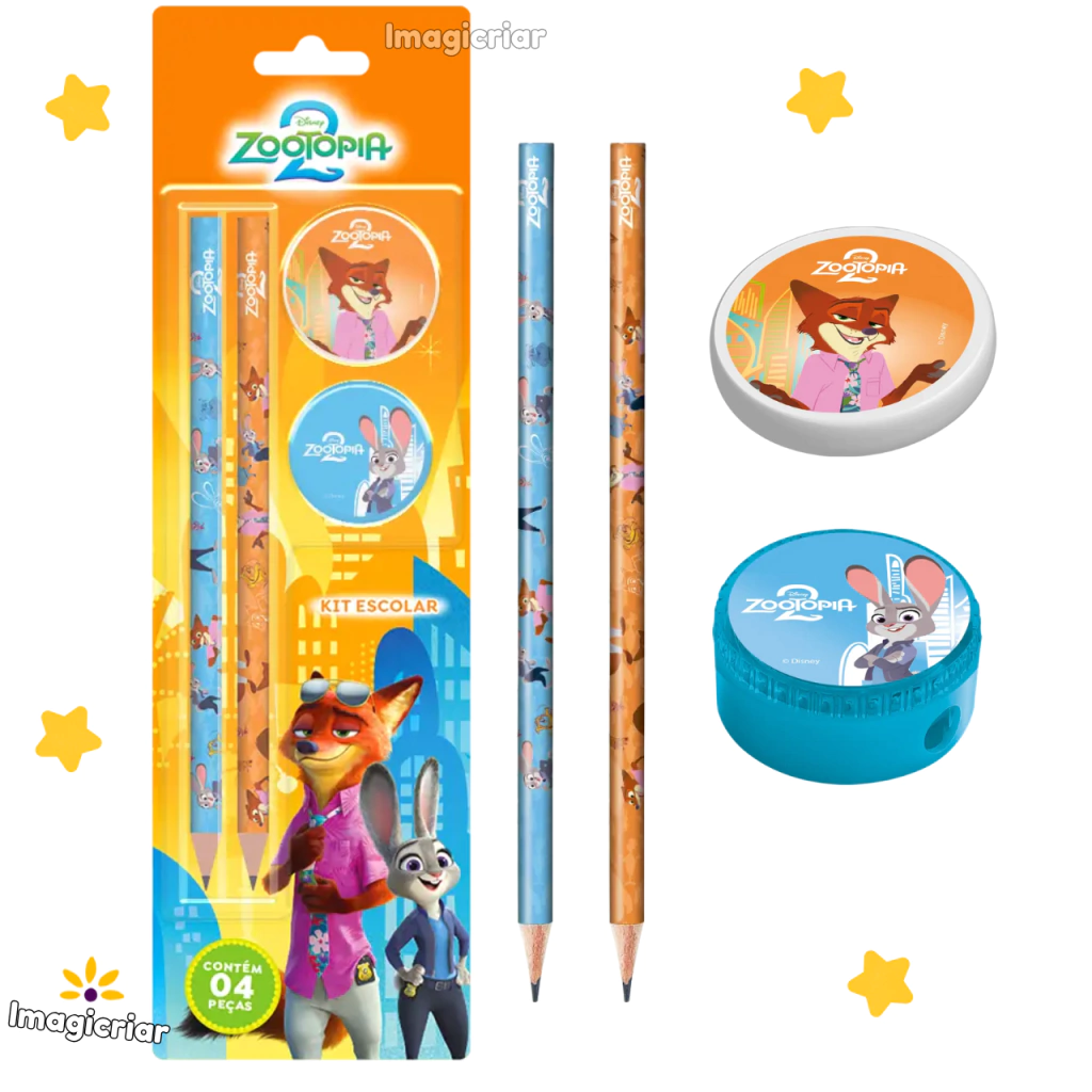 O kit perfeito para quem adora o filme Zootopia, da Disney! Com 2 lápis grafites, 1 apontador e 1 borracha, totalizando 4 itens, todos decorados com os personagens Judy e Nick!