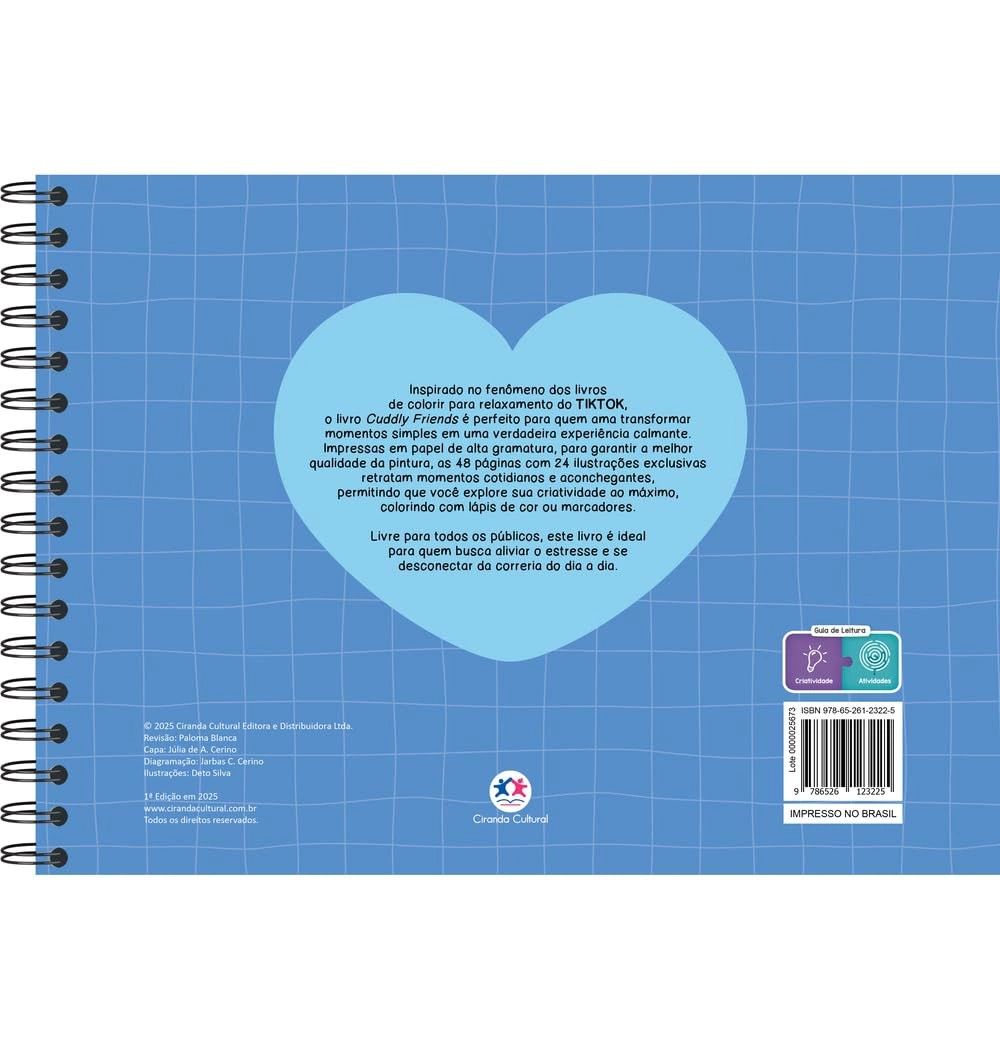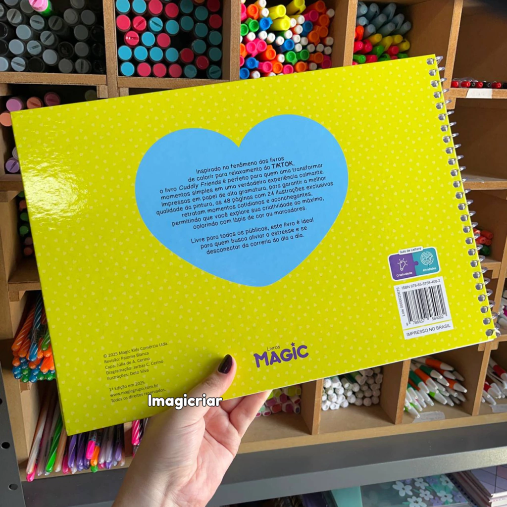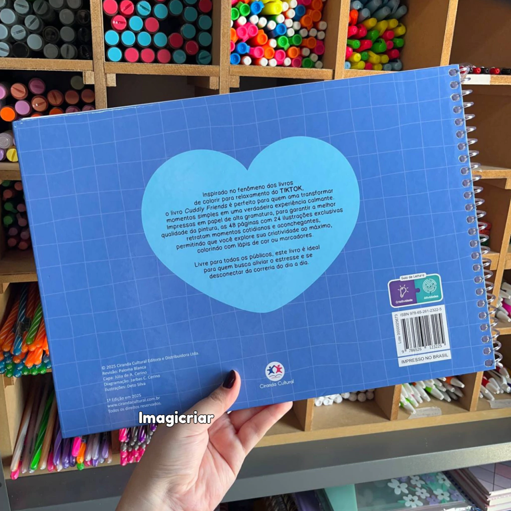 “Inspirado no fenômeno dos livros de colorir para relaxamento, o livro Cuddly Friends é perfeito para quem ama transformar momentos simples em uma verdadeira experiência calmante. Impressas em papel de alta gramatura, para garantir a melhor qualidade de pintura, as ilustrações retratam momentos cotidianos e aconchegantes, permitindo que você explore sua criatividade ao máximo, colorindo com lápis de cor ou marcadores. Livre para todos os públicos, este livro é ideal para quem busca aliviar o estresse e se desconectar da correria do dia a dia.”
