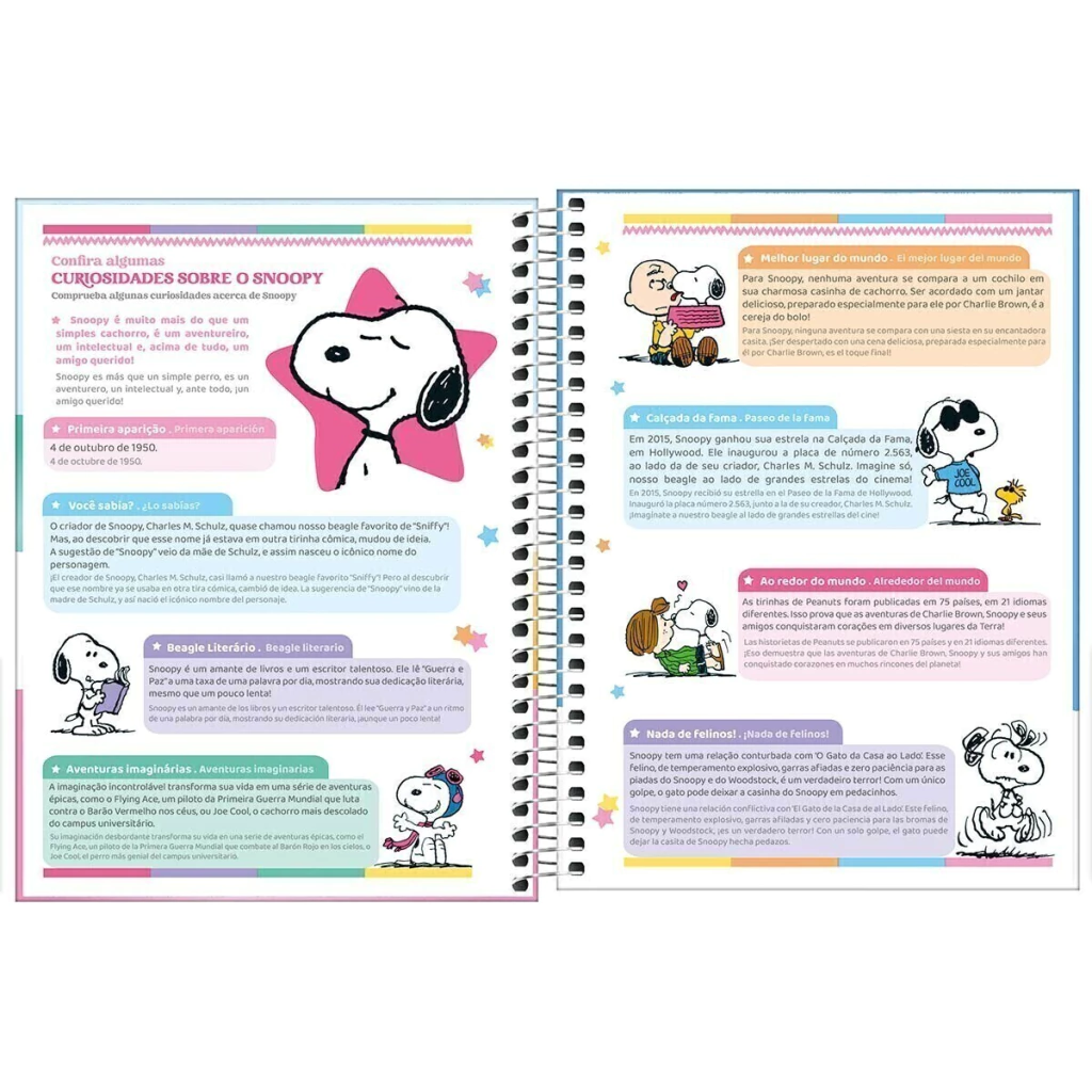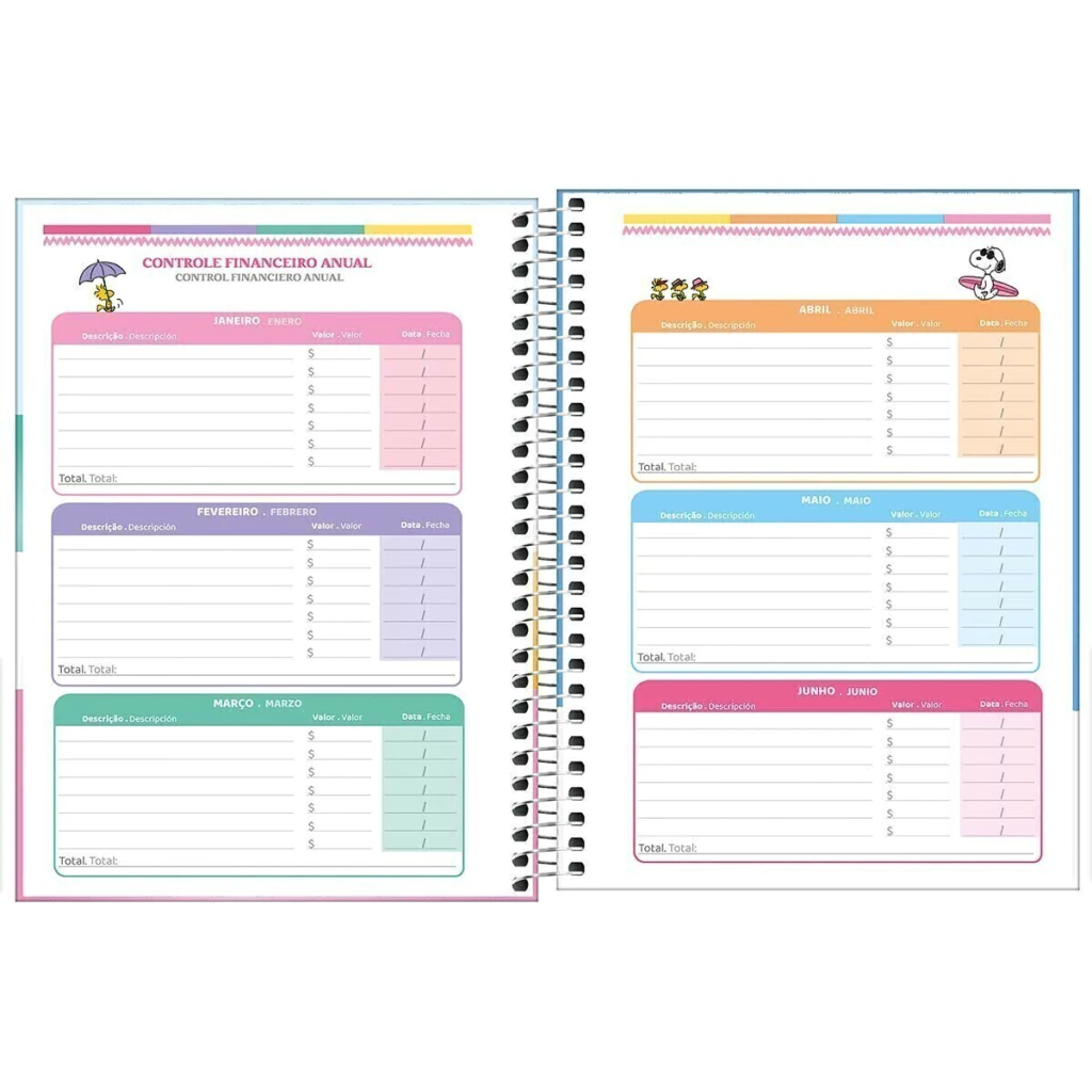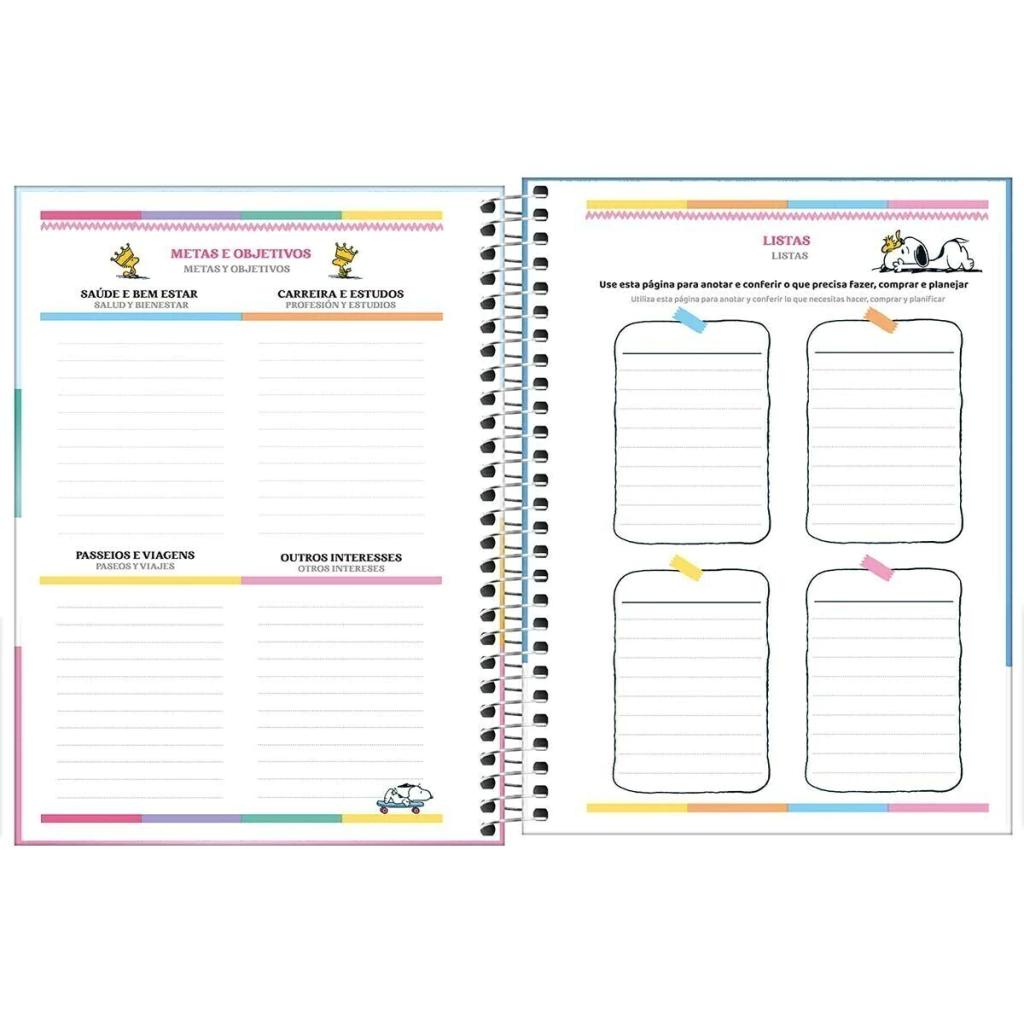 - Páginas decoradas com os seguintes temas: Planejamento Anual, Planejamento Mensal, Planejamento Semanal, Controle Financeiro Anual, Listas, Metas e Objetivos, Curiosidades sobre o Snoopy, Anotações;