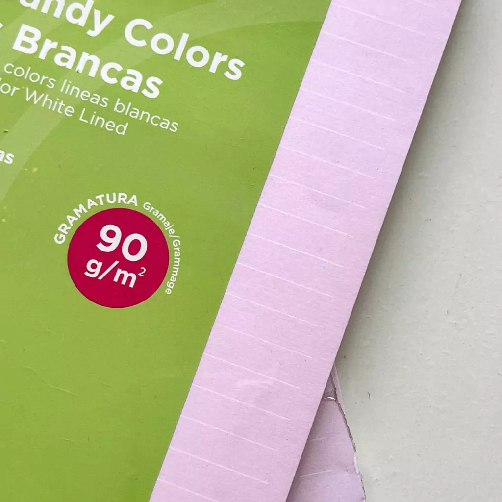 As folhas possuem gramatura 90g, 40 folhas (sendo 10 de cada cor, azul, rosa, roxo e verde) e estão disponíveis nos tamanhos A5, Médio e Grande.