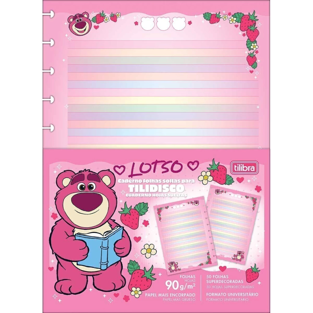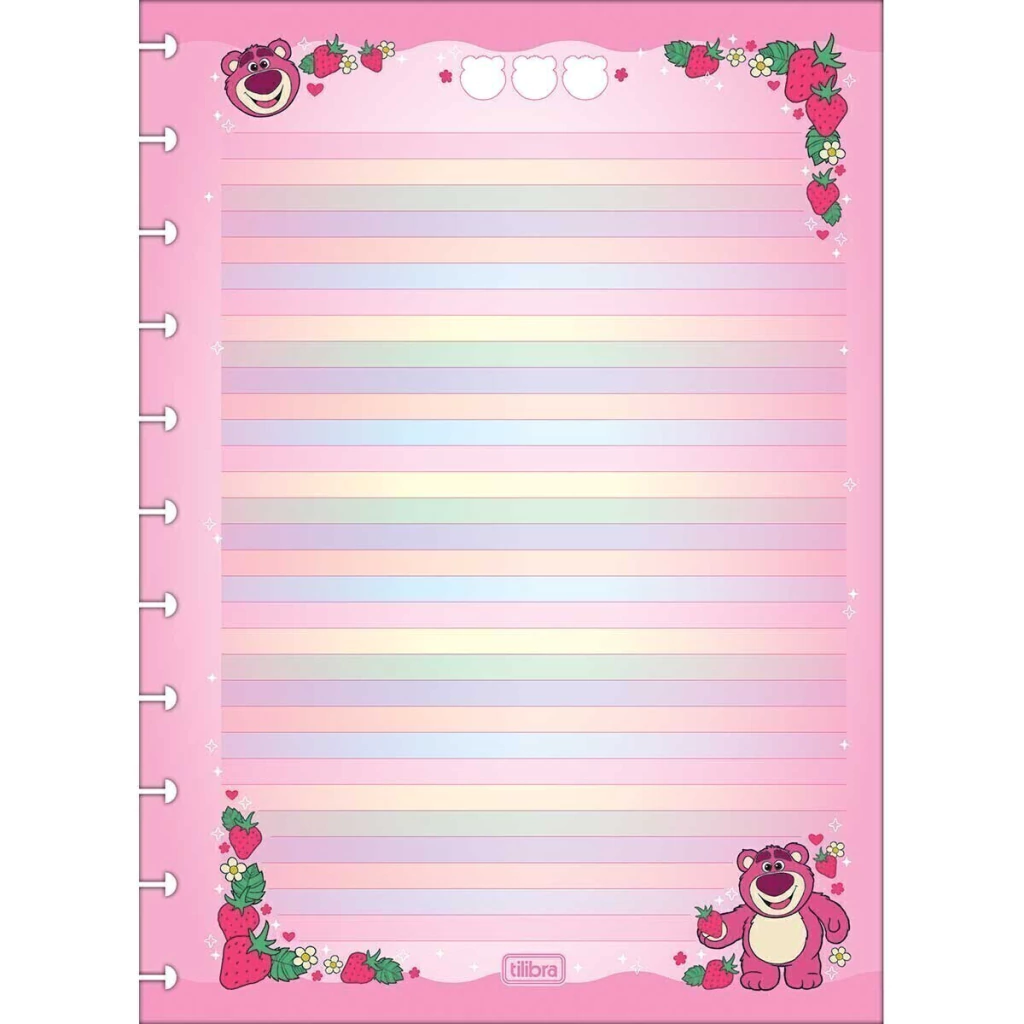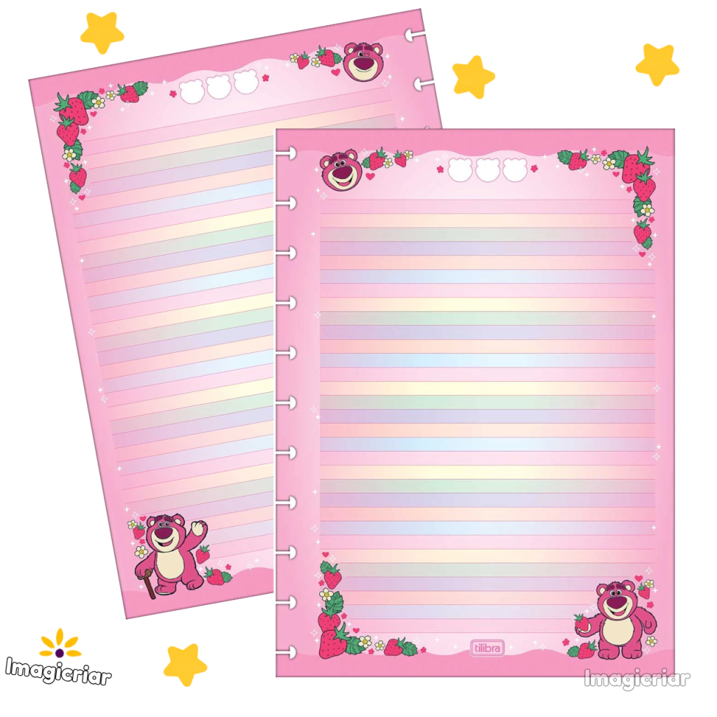 Refil pautado super decorado para o seu Tilidisco! São folhas soltas coloridas, com linhas e decoradas com o tema do Lotso, vilão do terceiro filme de Toy Story, super lindas!