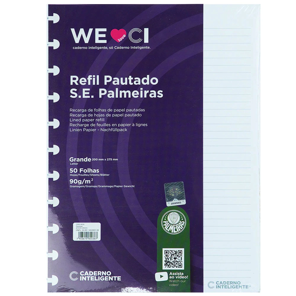Refil Pautado Palmeiras para o seu Caderno Inteligente! São folhas brancas com linhas pretas e marca d'água do Palmeiras para sempre estarem com você quando precisar.